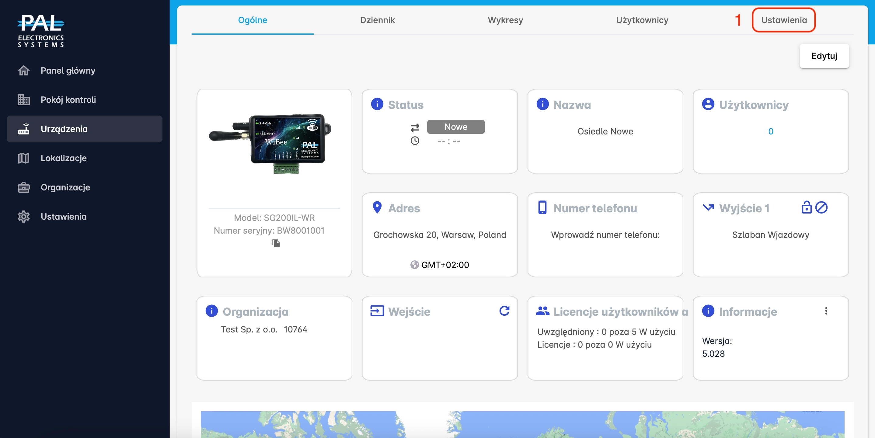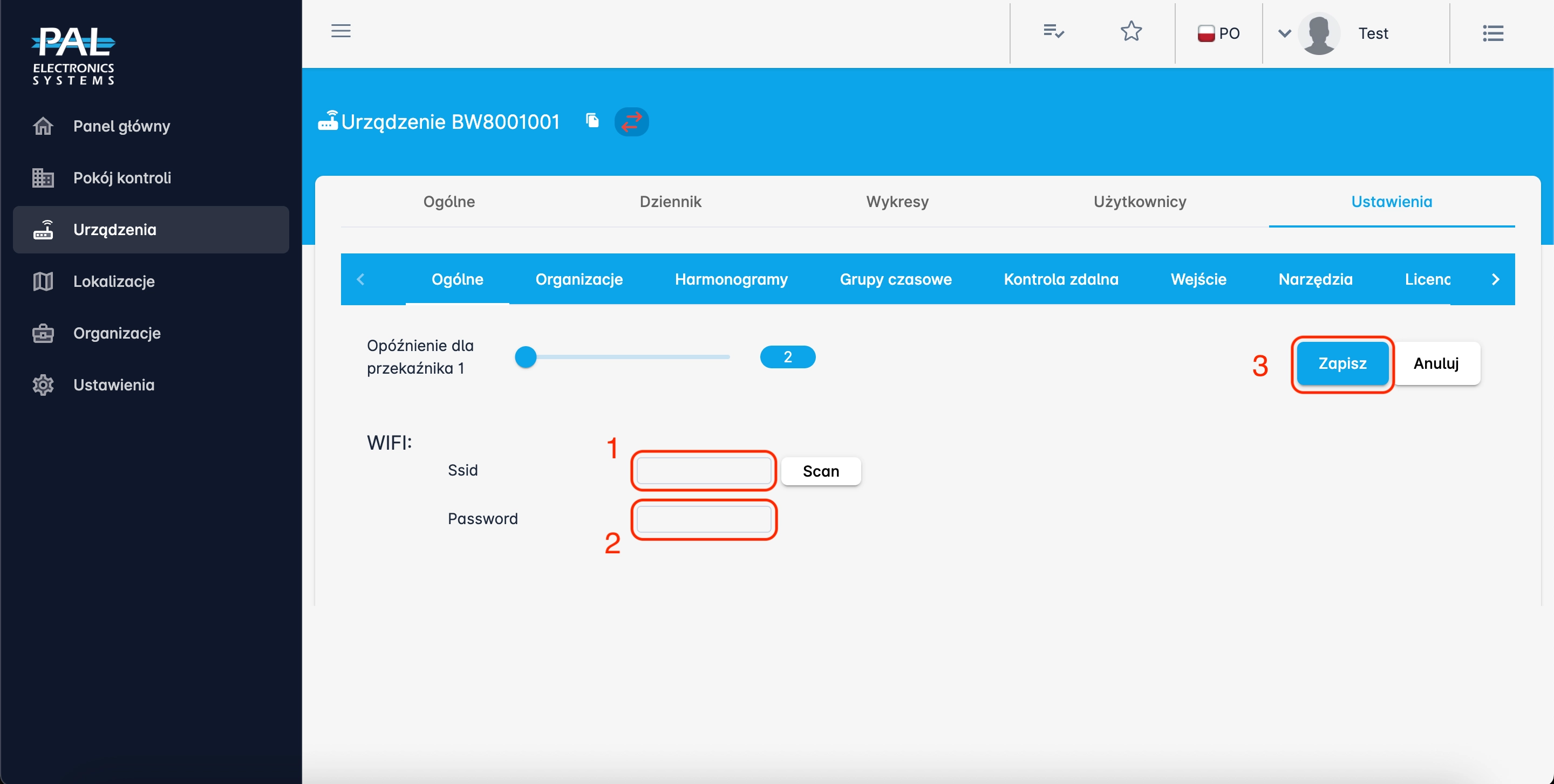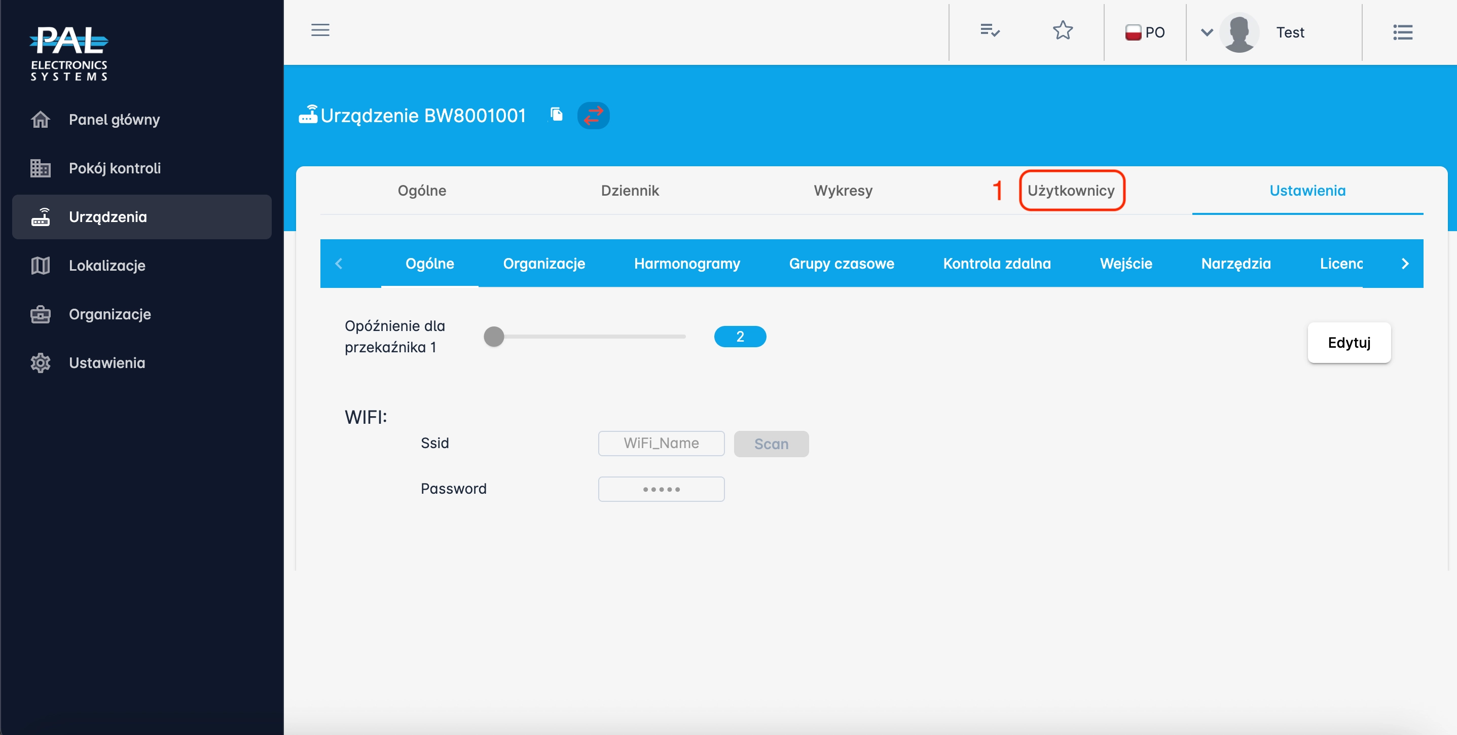 Kliknij „Synchronizuj teraz”, aby natychmiast zsynchronizować ustawienia, użytkowników i piloty. Po synchronizacji urządzenie połączy się z siecią WiFi wskazaną w panelu administratora. Jeśli ustawienia sieci WiFi zostały wprowadzone poprawnie, status urządzenia zmieni się na „online” i cała dalsza konfiguracja urządzenia będzie możliwa za pomocą panelu administratora WWW.