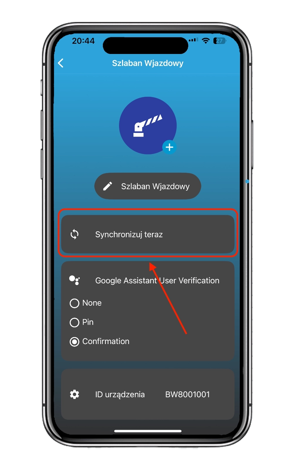 Po uruchomieniu aplikacji brama lub szlaban pojawi się automatycznie. Naciśnij ikonę „zębatki”, aby przejść do ustawień.