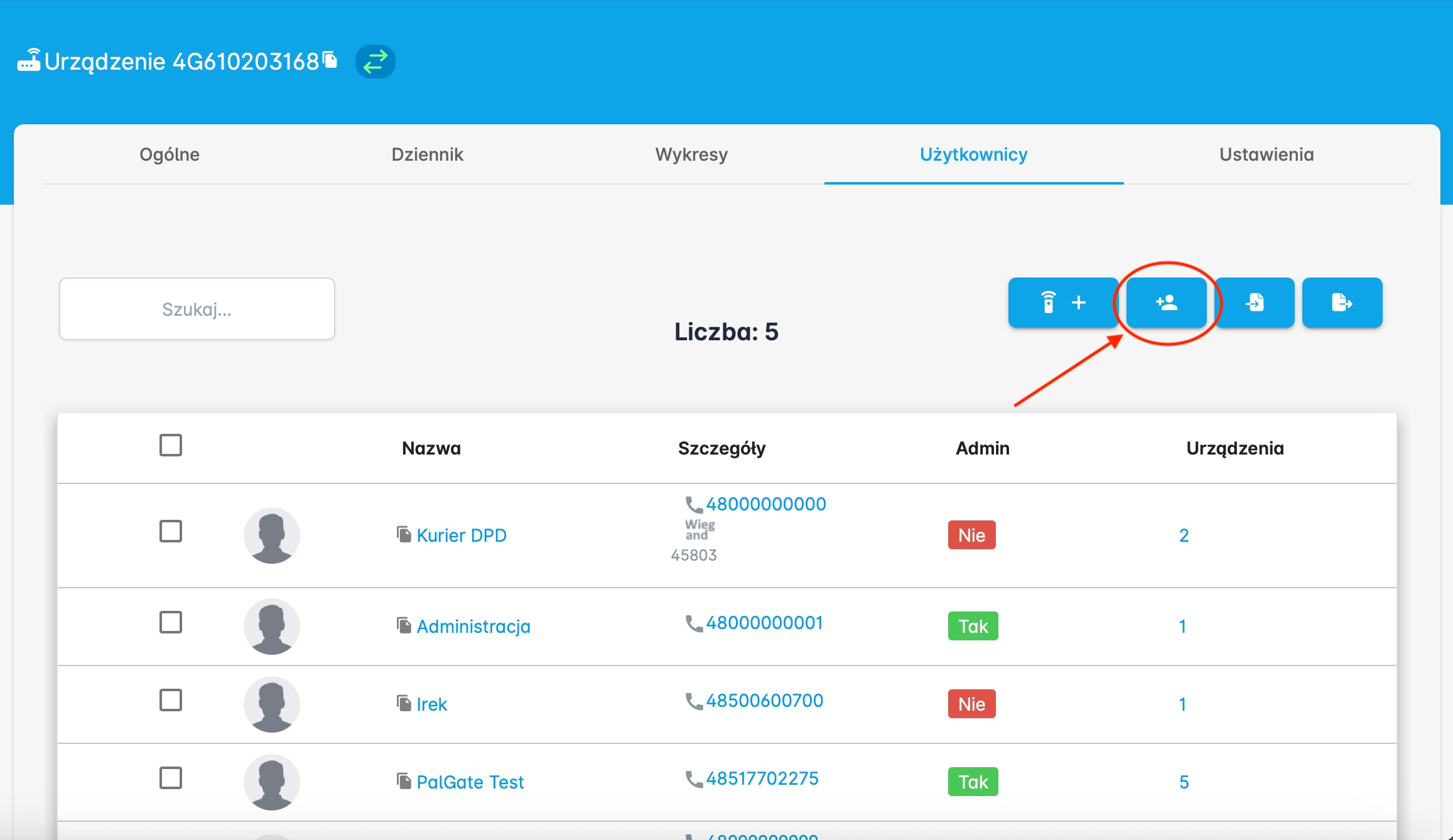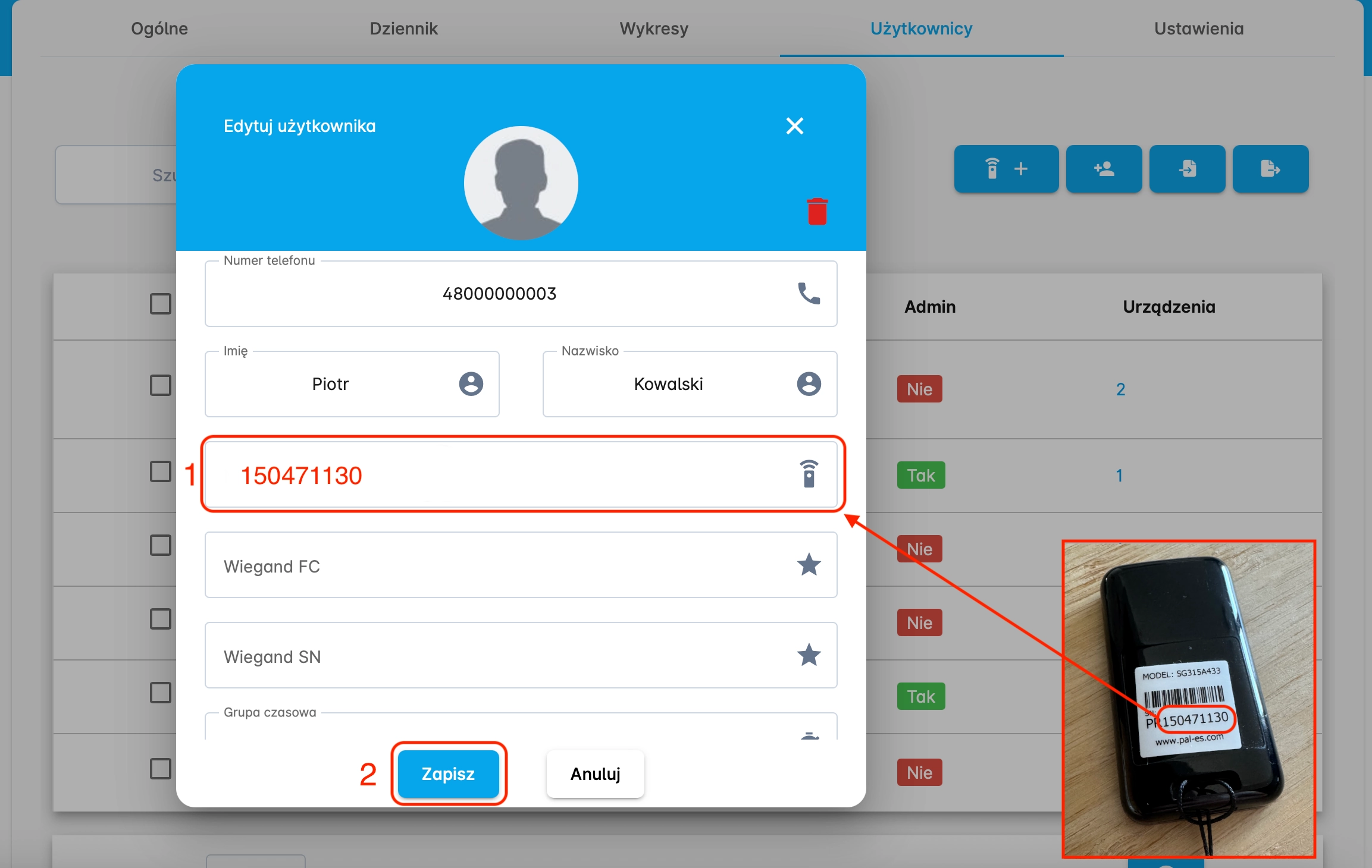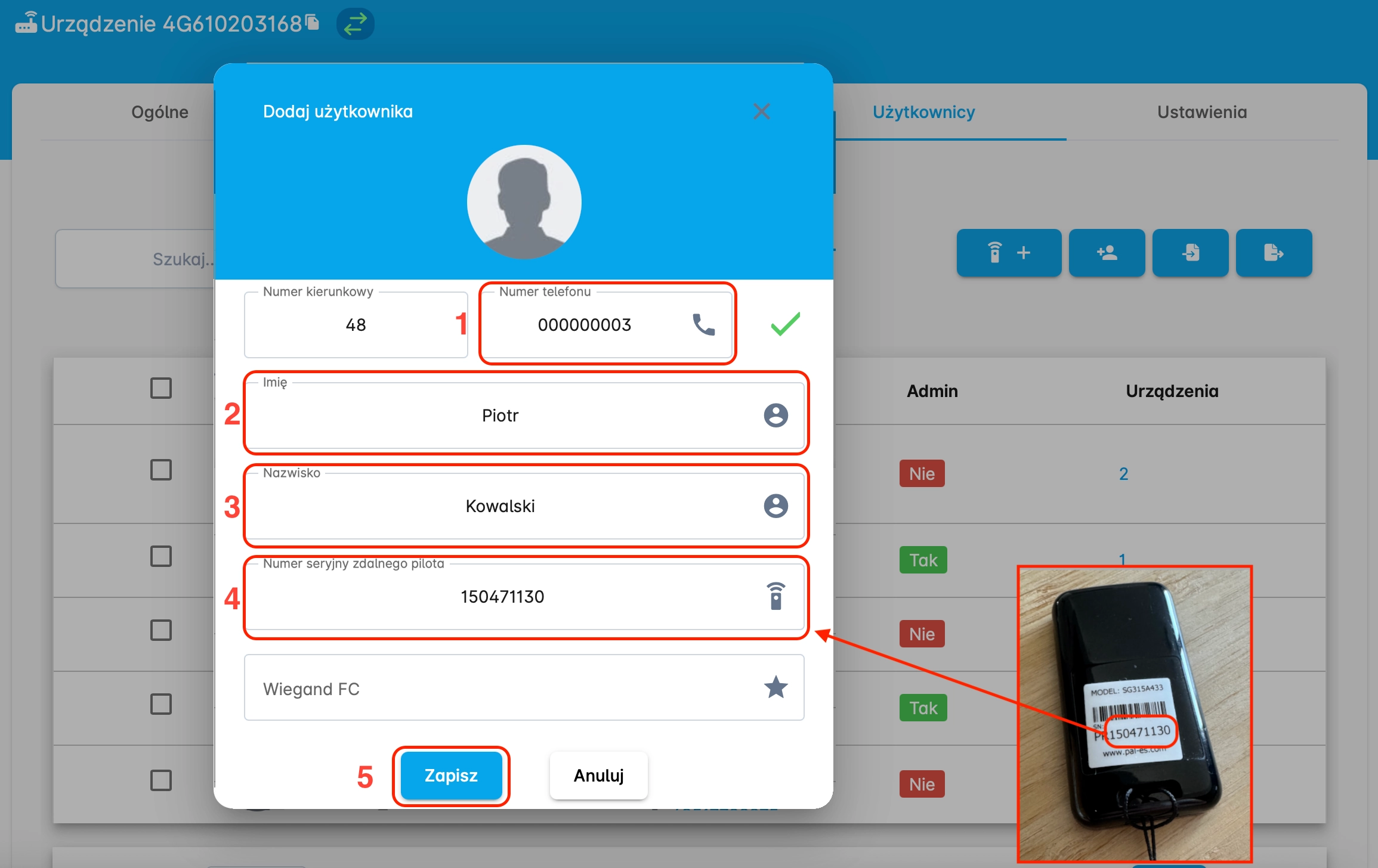 - Maciej Nowak z numerem telefonu 49000000001 i numerem seryjnym pilota 150471131