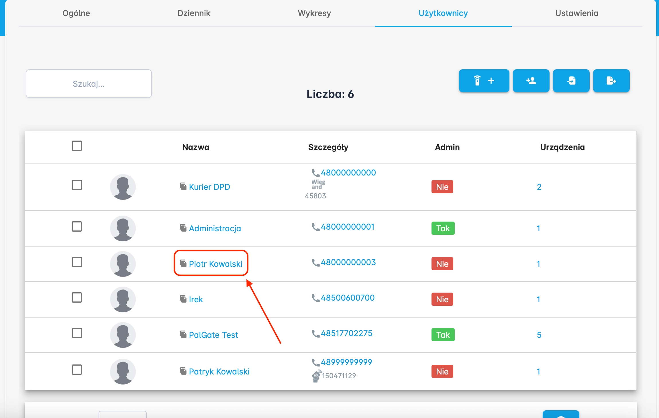 Na liście pojawili się użytkownicy, których dodaliśmy, oraz ich piloty.
