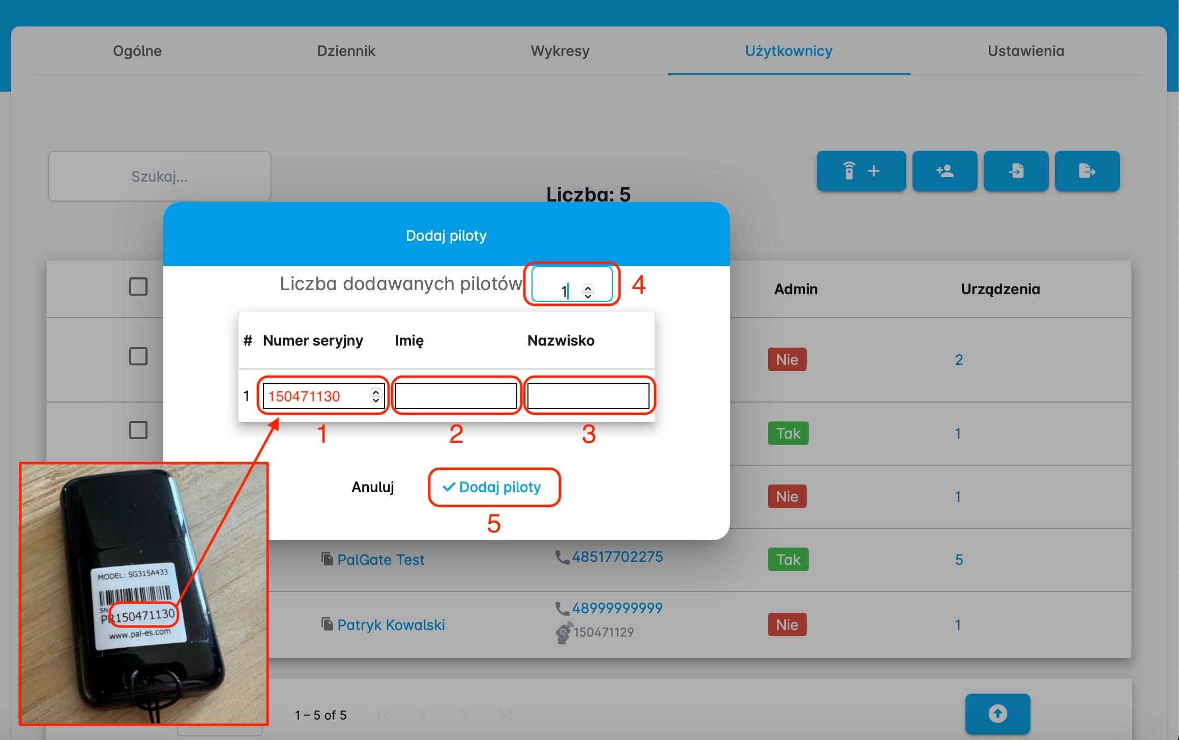 - Liczbę dodawanych pilotów. Przy dodawaniu więcej niż jednego pilota system automatycznie uzupełni pole z numerem seryjnym, zmieniając numer seryjny pilota.